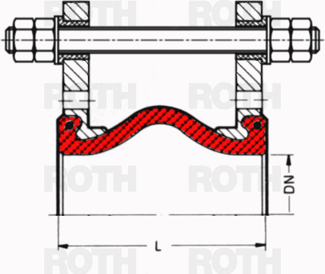 Standardmodell Gummikompensator einwellig mit ein- oder mehrlagigem Gummibalg, mit Zugstangensystem, zur Montage mit drehbaren Flanschen an der Rohrleitung.