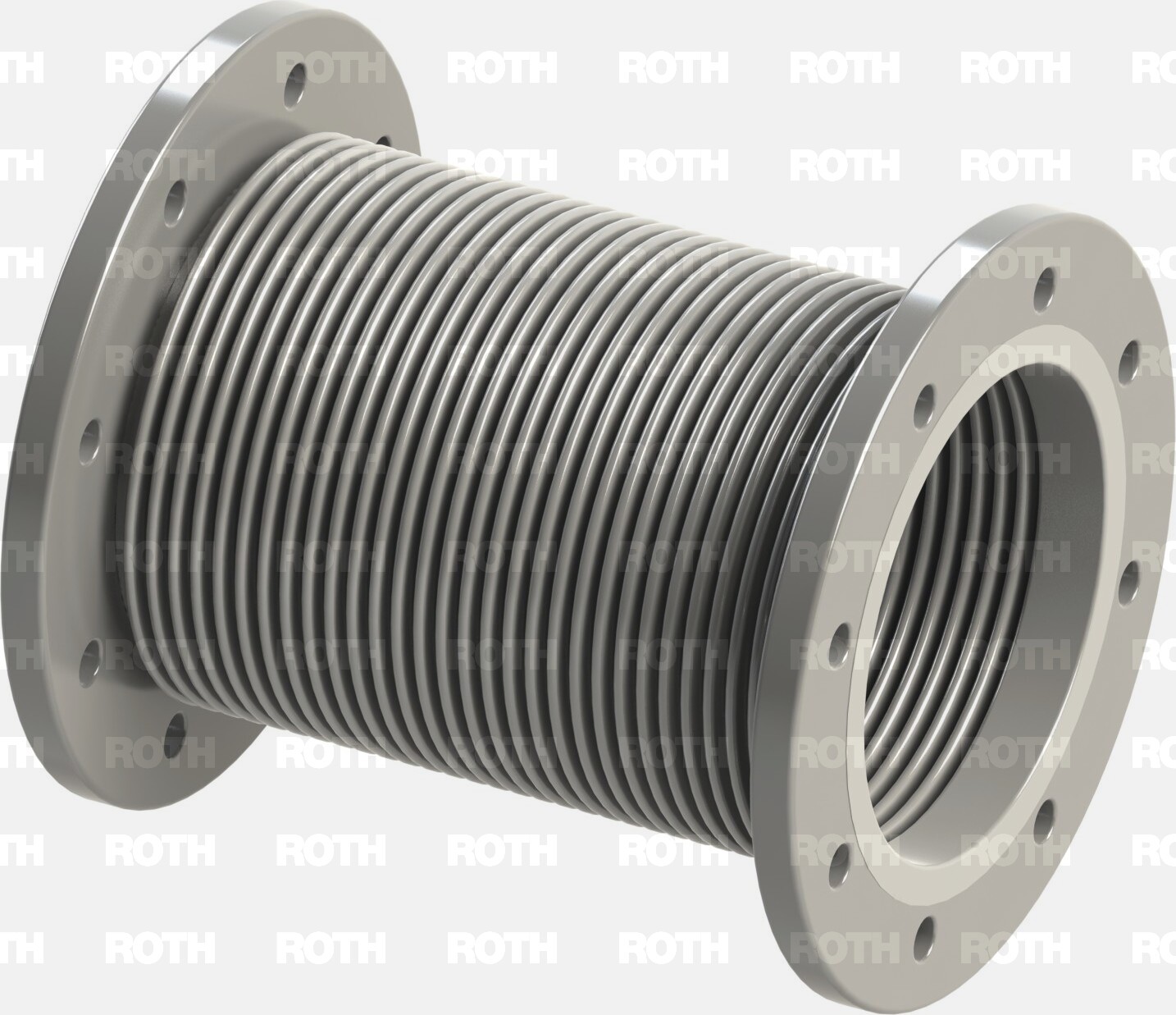 Axialkompensator aus Edelstahl mit ein- oder mehrlagigem Balg, zur Montage mit Flanschen (drehbar) in der Rohrleitung.