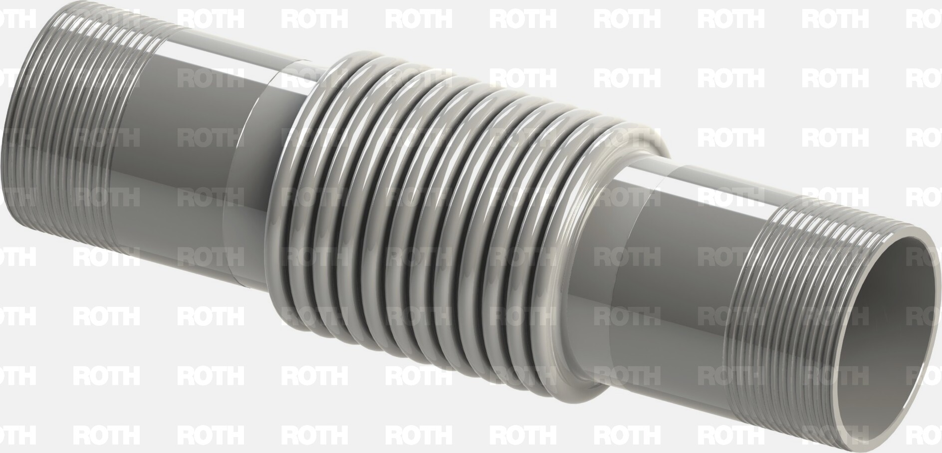 Axialkompensator aus Edelstahl mit ein- oder mehrlagigem Balg, zur Montage mit Außengewinde in der Rohrleitung.